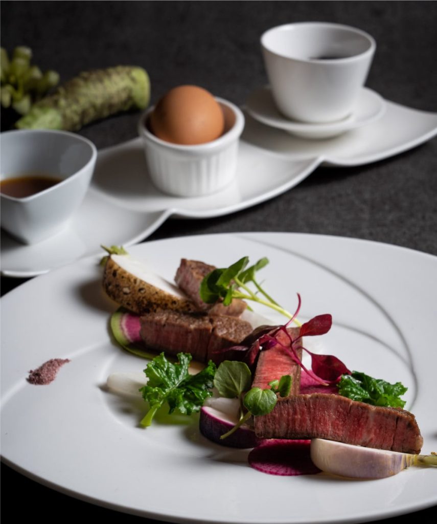 肉料理/山形牛フィレ肉のソテーとビーフシチュー わさび、わんぱく卵添え