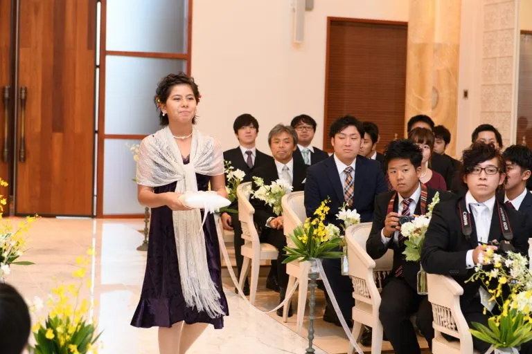 最近では入場の先導をしたり、リングを運んだりするお手伝いをしてもらうことが多いんです