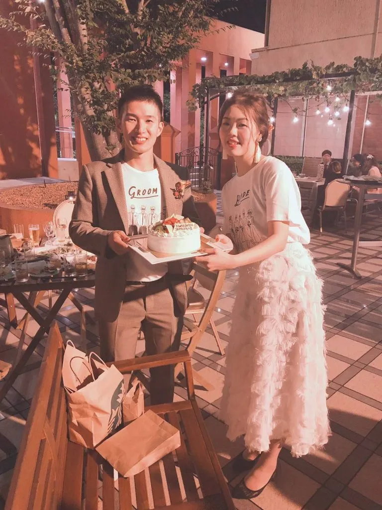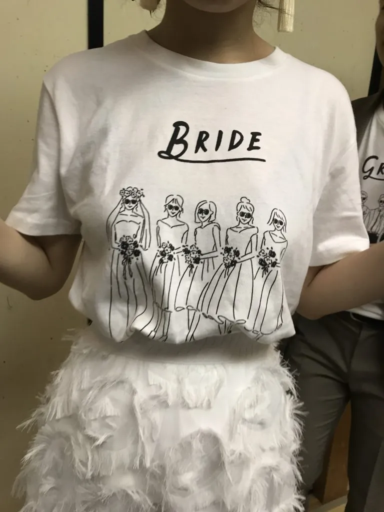 GROOMとBRIDEと書かれた真っ白なTシャツ